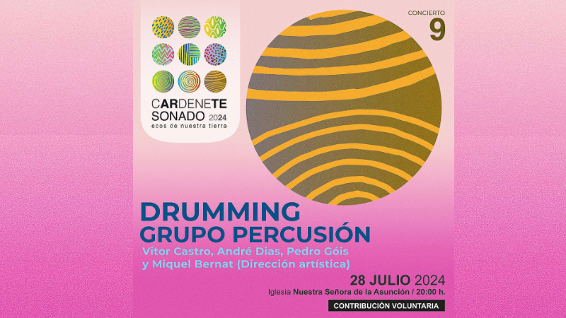 El próximo domingo 28 de julio de 2024, a las 20:00 h, la Iglesia Parroquial Nuestra Señora de la Asunción en Cardenete será el escenario del noveno concierto del festival cARdeneTE SONADO. Este evento, titulado “Ecos de Nuestra Tierra”, contará con la destacada participación del grupo de percusión Drumming.