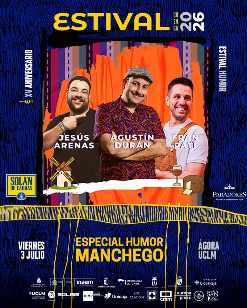 El cartel reúne a tres de los humoristas más conocidos del panorama cómico de Castilla-La Mancha. Agustín Durán se ha convertido en uno de los cómicos, músicos y presentadores más populares de la región gracias a su humor costumbrista y musical inspirado en la vida rural manchega. Además, muestra una destacada presencia en televisión, radio y redes sociales. Por su parte, Fran Pati se ha consolidado como monologuista y guionista dentro del circuito nacional de comedia. Así, ha actuado en teatros, festivales y espacios televisivos dedicados al stand-up. Completa el elenco Jesús Arenas, actor, humorista y clarinetista bien conocido en Estival Cuenca, ya que es la cuarta ocasión en la que actúa en el festival internacional conquense. En su performance combina monólogo, improvisación y música en directo en espectáculos que mezclan teatro y comedia con una fuerte conexión con el público.