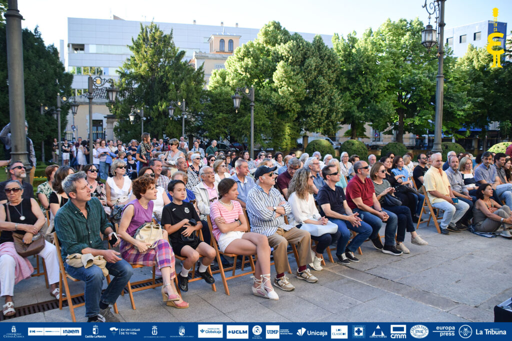 La Big Band UCLM se deleitó ante más de un centenar de asistentes que abarrotó el acceso al Palacio provincial de Diputación, disfrutando de un concierto musical al aire libre y cargado de temas de jazz, mambo, funky, soul… un repertorio que maravilló a los espectadores de la mano de los 28 músicos de esta particular orquesta impulsada por el ente universitario. Una vez más, Estival marca también su compromiso con las entidades académicas, cumpliendo en esta edición de nuevo con su apartado #EstivalUCLM en el que las formaciones de la Universidad de Castilla-La Mancha gozan de la oportunidad de actuar y hacer ver el talento y el trabajo que hay detrás de tanta formación.