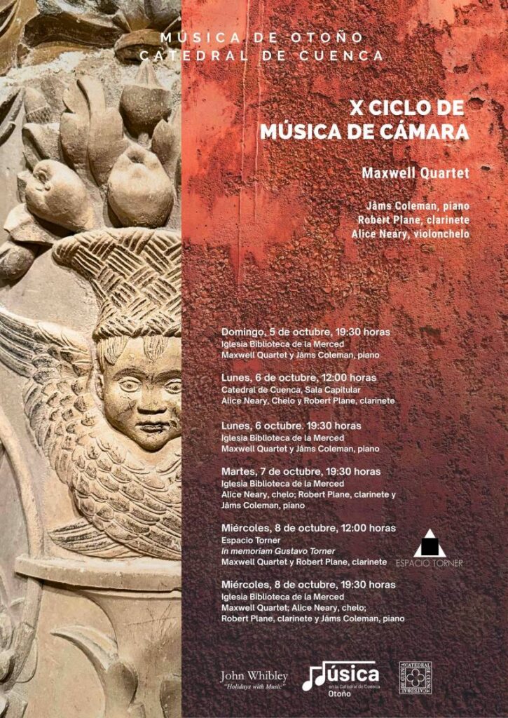 La programación se abrirá el domingo 5 de octubre en la Iglesia Biblioteca de la Merced con el Maxwell Quartet y Jâms Coleman. El lunes 6, la Sala Capitular de la Catedral recibirá a Alice Neary y Robert Plane en sesión matinal, y por la tarde la Merced volverá a acoger al cuarteto con piano. El martes 7 será el turno de un trío de cámara con Neary, Plane y Coleman. El ciclo culminará el miércoles 8 con un doble homenaje: al mediodía, en el Espacio Torner, se celebrará un concierto In memoriam Gustavo Torner, y por la tarde se cerrará en la Merced con la participación conjunta de todos los intérpretes.