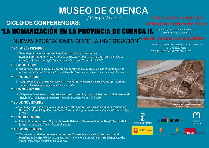 El Museo de Cuenca acoge el próximo jueves 23 de octubre de 2025, a las 17:30 horas, la conferencia titulada “Arquitectura y usos funerarios en la necrópolis septentrional de Segobriga”, impartida por Rosario Cebrián Fernández profesora titular de la UCM. La cita tendrá lugar en la Sala de Conferencias “Segóbriga” del propio museo (C/ Obispo Valero, 12) y forma parte del ciclo “LA ROMANIZACIÓN EN LA PROVINCIA DE CUENCA II. NUEVAS APORTACIONES DESDE LA INVESTIGACIÓN“, que se está impartiendo en el museo durante este segundo semestre del año.