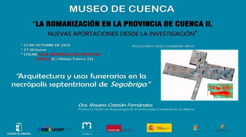 El Museo de Cuenca acoge el próximo jueves 23 de octubre de 2025, a las 17:30 horas, la conferencia titulada “Arquitectura y usos funerarios en la necrópolis septentrional de Segobriga”, impartida por Rosario Cebrián Fernández profesora titular de la UCM. La cita tendrá lugar en la Sala de Conferencias “Segóbriga” del propio museo (C/ Obispo Valero, 12) y forma parte del ciclo “LA ROMANIZACIÓN EN LA PROVINCIA DE CUENCA II. NUEVAS APORTACIONES DESDE LA INVESTIGACIÓN“, que se está impartiendo en el museo durante este segundo semestre del año.