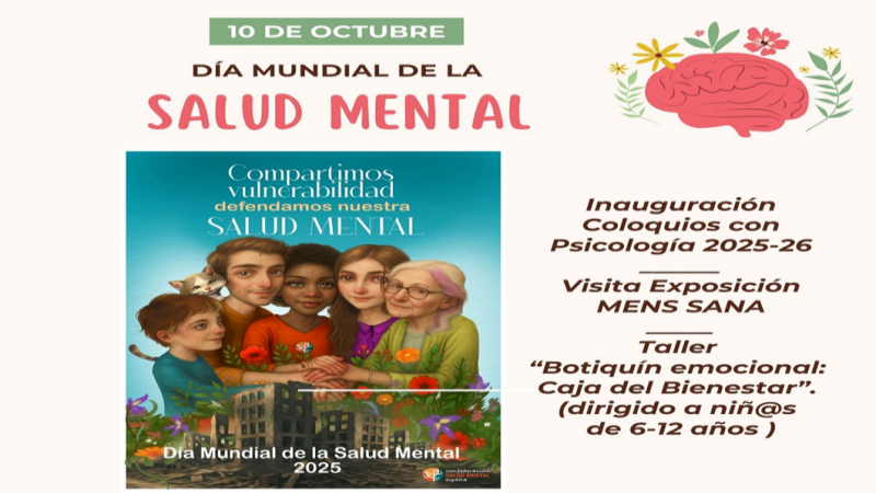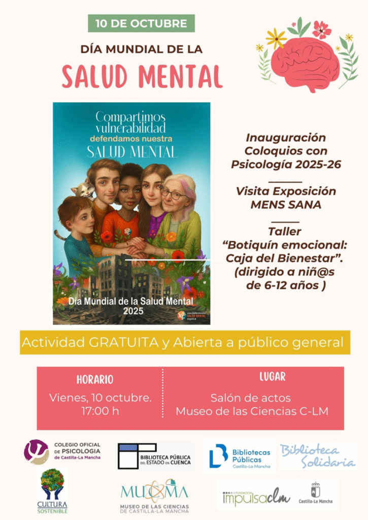 Por la tarde, a partir de las 17:30 h, se inaugurará el “Ciclo de Coloquios con Psicología 2025-26”, impulsado por el Colegio Oficial de la Psicología de Castilla-La Mancha y la Biblioteca Pública del Estado en Cuenca. Esta primera sesión incluirá una visita guiada a la exposición MENS SANA y un taller emocional “Botiquín: Caja del Bienestar”, destinado a niños y niñas de entre 6 y 11 años.