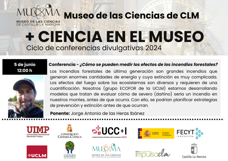Este miércoles 5 de junio, a las 12:00 horas en el Salón de Actos del Museo de las Ciencias de Castilla La Mancha y dentro del programa + CIENCIA EN EL MUSEO, desarrollado por la Unidad de Cultura Científica e Innovación de la UCLM en colaboración con el Museo de las Ciencias de Castilla-La Mancha tendrá lugar la conferencia ¿Cómo se pueden medir los efectos de los incendios forestales? a cargo de Jorge Antonio de las Heras Ibáñez.
