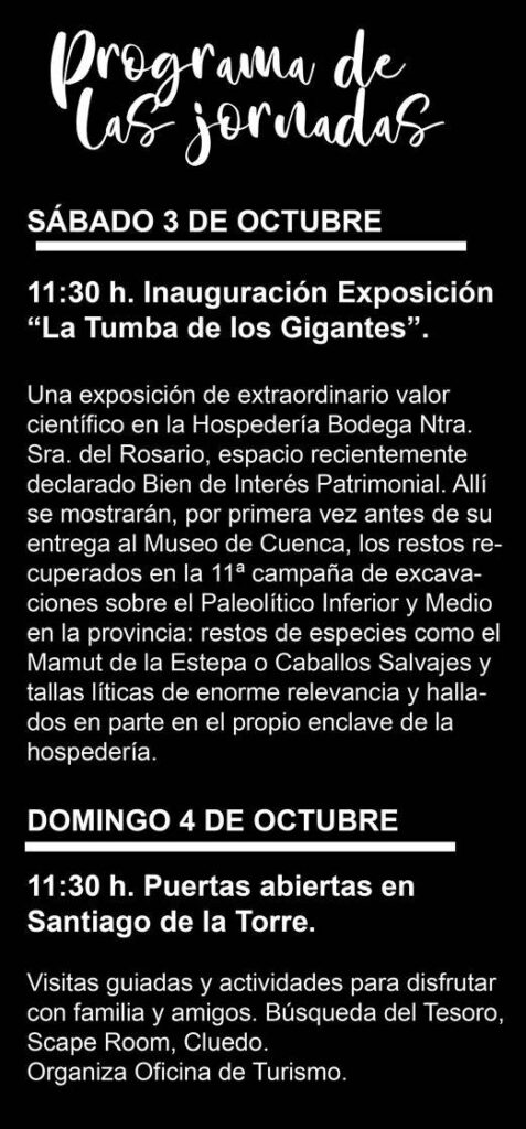 La programación arrancará el 3 de octubre con una exposición de extraordinario valor científico en la Hospedería-Bodega Nuestra Señora del Rosario, espacio recientemente declarado Bien de Interés Patrimonial. Allí se mostrarán, por primera vez antes de su entrega al Museo de Cuenca, los restos recuperados en la 11ª campaña de excavaciones sobre el Paleolítico Inferior y Medio en la provincia: restos de especies como el Mamut de la Estepa o Caballos Salvajes y tallas líticas de enorme relevancia y hallados en parte en el propio enclave de la hospedería. Este espacio será además el germen de una futura exposición permanente que convertirá a El Provencio en un punto de referencia arqueológica en Castilla-La Mancha.