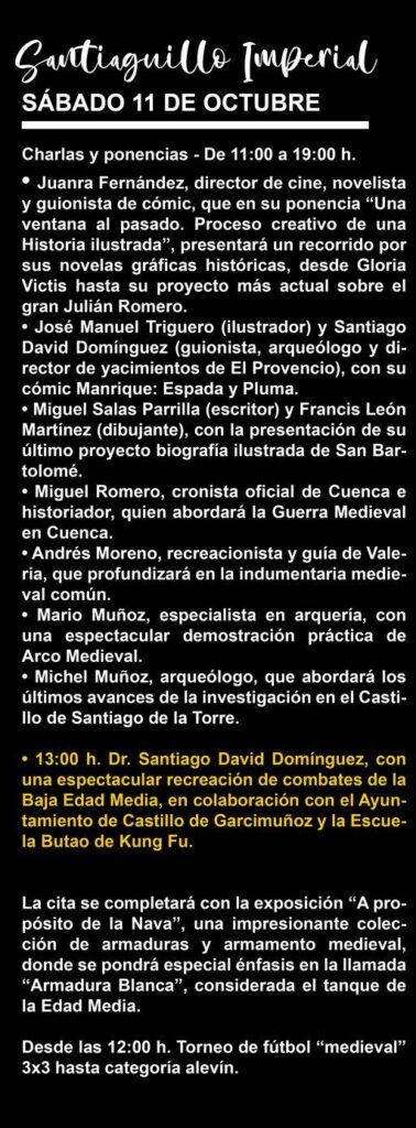 La clausura llegará el 11 de octubre con Santiaguillo Medieval – Parte II, coincidiendo con el Día de la Hispanidad, en una jornada de especial proyección cultural que reunirá a invitados de prestigio nacional e internacional, y donde el recreacionismo histórico y la Feria Internacional del Cómic de El Provencio cobrarán especial interés.