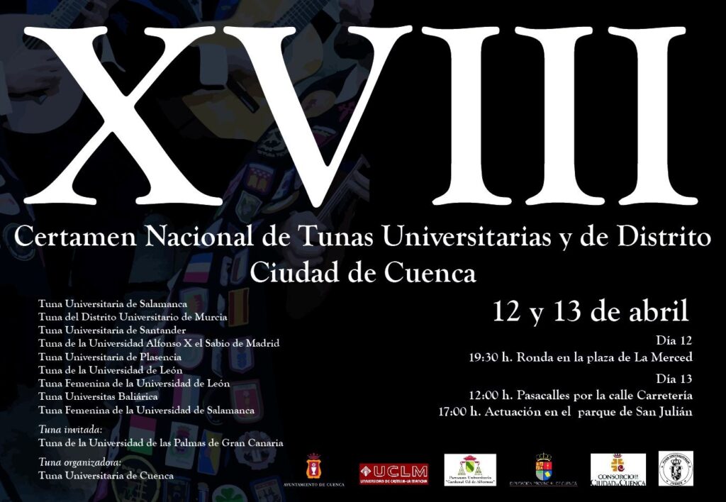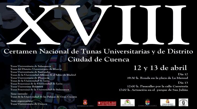 Este fin de semana, del viernes 12 al sábado13 de abril, tendrá lugar el XVIII Certamen Nacional de Tunas Universitarias y de Distrito Ciudad de Cuenca, que reune en la ciudad a once tunas provenientes de diferentes ciudades españolas.