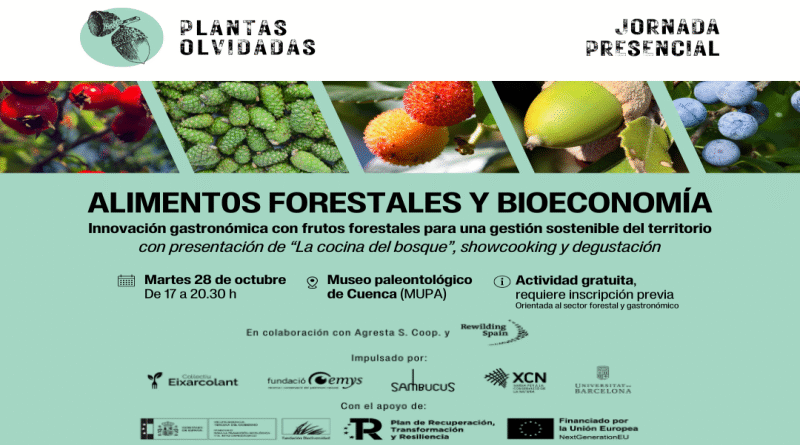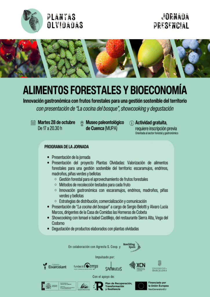 La jornada “Alimentos Forestales y Bioeconomía: Innovación Gastronómica con Frutos Forestales para una Gestión Sostenible del Territorio” expondrá el potencial de estas cinco “plantas olvidadas” el martes 28 de octubre en el Museo paleontológico de Cuenca (MUPA) de 17:00 a 20:30 h. Se revisarán las oportunidades del aprovechamiento de cada uno de los frutos forestales: escaramujos, madroños, endrinos, bellotas y piñas.