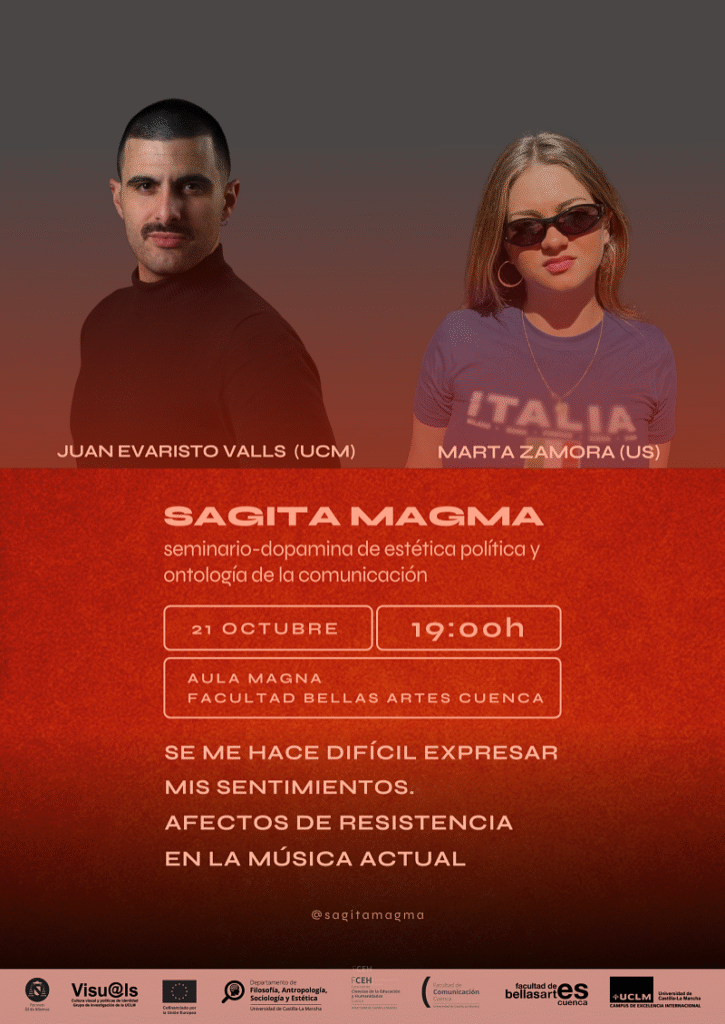 El próximo martes 21 de octubre a las 19:00 h, el seminario SAGITA MAGMA, dirigido por los docentes de la UCLM Nacho Escutia y Andrés M. García Romero, acoge la sesión titulada “Se me hace difícil expresar mis sentimientos. Afectos de resistencia en la música actual”. La actividad tendrá lugar en el Aula Magna de la Facultad de Bellas Artes del Campus de Cuenca de la Universidad de Castilla-La Mancha. La sesión contará con la participación de Juan Evaristo Valls (Universidad Complutense de Madrid), autor del superventas El derecho a las cosas bellas. Vindicación de la vida holgada(Editorial Ariel, 2025), y Marta Zamora (Universidad de Sevilla). Ambos explorarán cómo las prácticas musicales contemporáneas se han convertido en espacios de resistencia afectiva y política, abriendo caminos alternativos para pensar la sensibilidad y los afectos en este presente confuso que nos atraviesa.