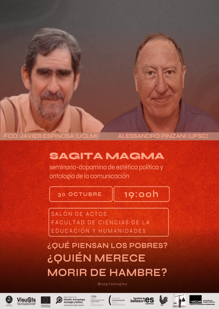 El próximo jueves 30 de octubre a las 19:00 h, el seminario SAGITA MAGMA, dirigido por los docentes de la UCLM Nacho Escutia y Andrés M. García Romero, acoge la sesión titulada “¿Qué piensan los pobres? – ¿Quién merece morir de hambre?”. La sesión tendrá lugar en el Salón de actos de la Facultad de Ciencias de la Educación y Humanidades (Cuenca) y contará con la participación de los filósofos y profesores Fco. Javier Espinosa (UCLM) yAlessandro Pinzani (UFSC), proveniente este último de la Universidade Federal de Santa Catarina (Brasil).