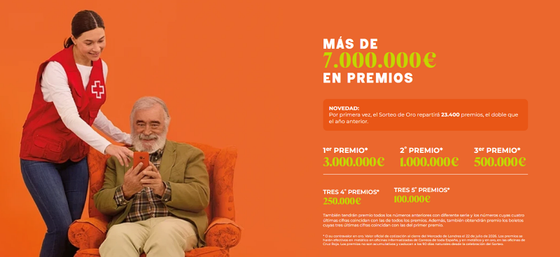 El Sorteo de Oro de Cruz Roja es una iniciativa solidaria con 47 años de historia que permite a la ciudadanía, por tan sólo 6€, formar parte de un movimiento humanitario que transforma vidas. Su recaudación impulsa la capacidad de Cruz Roja de actuar ante las grandes emergencias, pero también en las situaciones cotidianas del día a día que pueden afectar a personas de nuestro entorno más cercano.