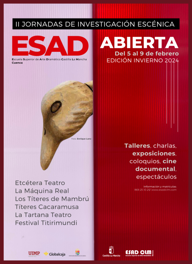 La segunda edición de las Jornadas de Investigación Escénica, iniciadas el año pasado por la ESAD (Escuela de Arte Dramático de Castilla-La Mancha), se llevarán a cabo del 5 al 9 de febrero en sus instalaciones en Cuenca.