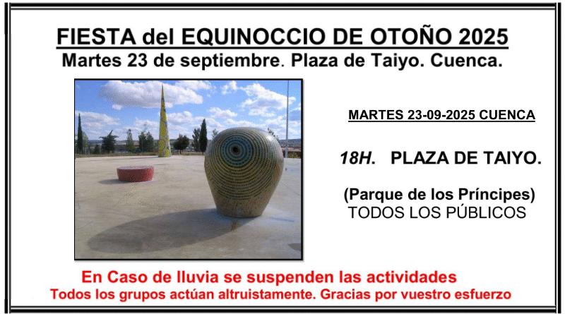 La Plaza de Taiyo, en el Parque de los Príncipes de Cuenca, será el escenario el próximo martes 23 de septiembre de 2025 a las 18:00 horas de la tradicional celebración del Equinoccio de Otoño, un evento abierto a todos los públicos que celebra el cambio de estación con un variado programa de actividades culturales y artísticas.