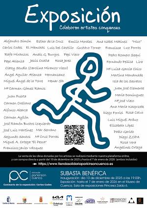 Organizada por la Asociación Parkinson Cuenca y la Junta de Comunidades, se inaugurará el próximo 10 de diciembre, a las 19:00 horas, en la Sala de Exposiciones Princesa Zaida de la capital conquense, una nueva exposición a favor de la Asociación Parkinson Cuenca. Se trata de la IX edición de esta importante cita benéfica. La exposición, comisariada por el artista conquense Carlos Codes, está compuesta por obras de los mejores artistas, ceramistas, fotógrafos y pintores de reconocido prestigio de la ciudad, que han donado sus obras para realizar una exposición benéfica.