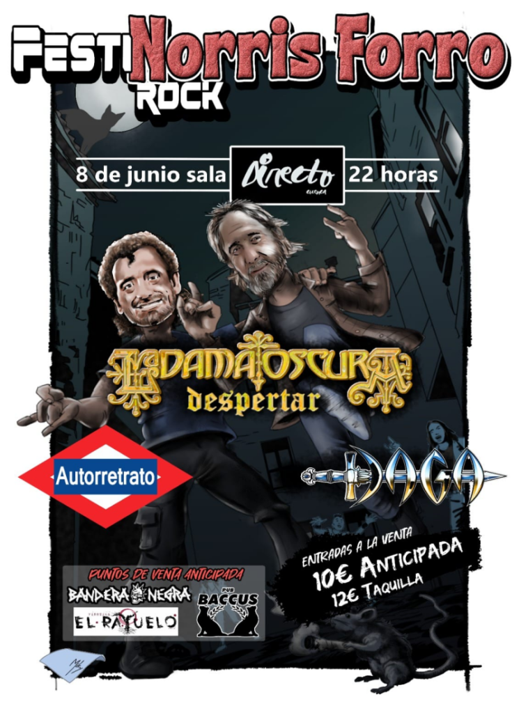 Ven al FestiNorris Forro Rock en la Sala Directo de Cuenca el próximo día 8 de junio a partir de las 22:00 horas y disfruta de un festival inolvidable. La Dama Oscura, Daga y Autorretrato serán los encargados de llenar de buen Rock la sala.