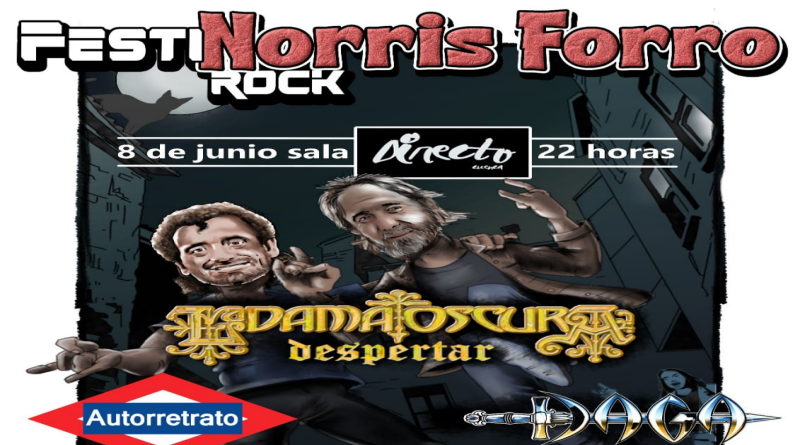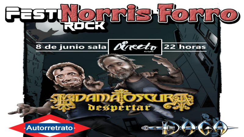 Ven al FestiNorris Forro Rock en la Sala Directo de Cuenca el próximo día 8 de junio a partir de las 22:00 horas y disfruta de un festival inolvidable. La Dama Oscura, Daga y Autorretrato serán los encargados de llenar de buen Rock la sala.