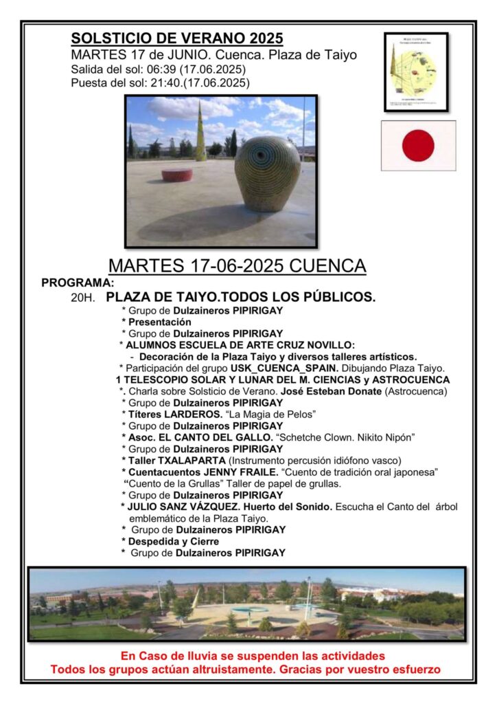 La Plaza de Taiyo (Parque de los Príncipes) de la capital conquense acogerá el próximo lunes 17 de junio la Fiesta del Solsticio de Verano, una actividad abierta al público con la que se quiere dar la bienvenida al verano. El evento, de carácter gratuito y familiar, comenzará a las 20:00 horas y reunirá música tradicional, astronomía, cuentacuentos, arte y participación ciudadana en un entorno emblemático.