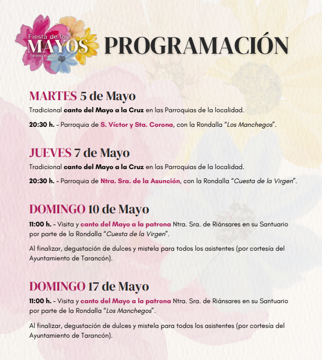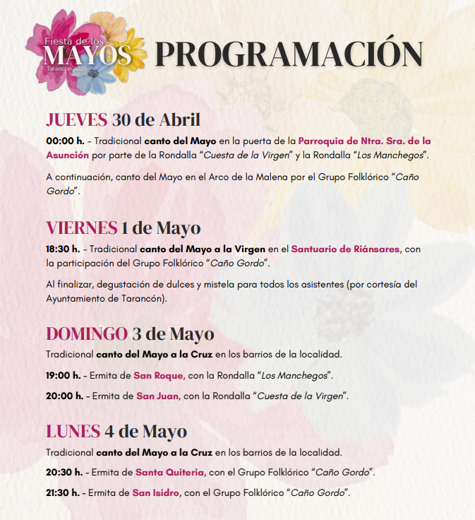 La fiesta dará comienzo en la medianoche del 30 de abril con el tradicional canto del Mayo en Tarancón, en la puerta de la Parroquia de Nuestra Señora de la Asunción, un acto simbólico que marca el inicio de un mes en el que la música tradicional manchega y la participación vecinal serán protagonistas .