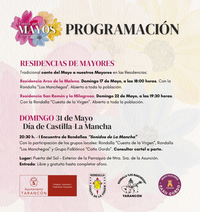 Durante el mes de mayo, agrupaciones como la Rondalla “Cuesta de la Virgen”, la Rondalla “Los Manchegos” y el Grupo Folklórico “Caño Gordo” protagonizarán los distintos actos, interpretando los Mayos tradicionales en Tarancón
