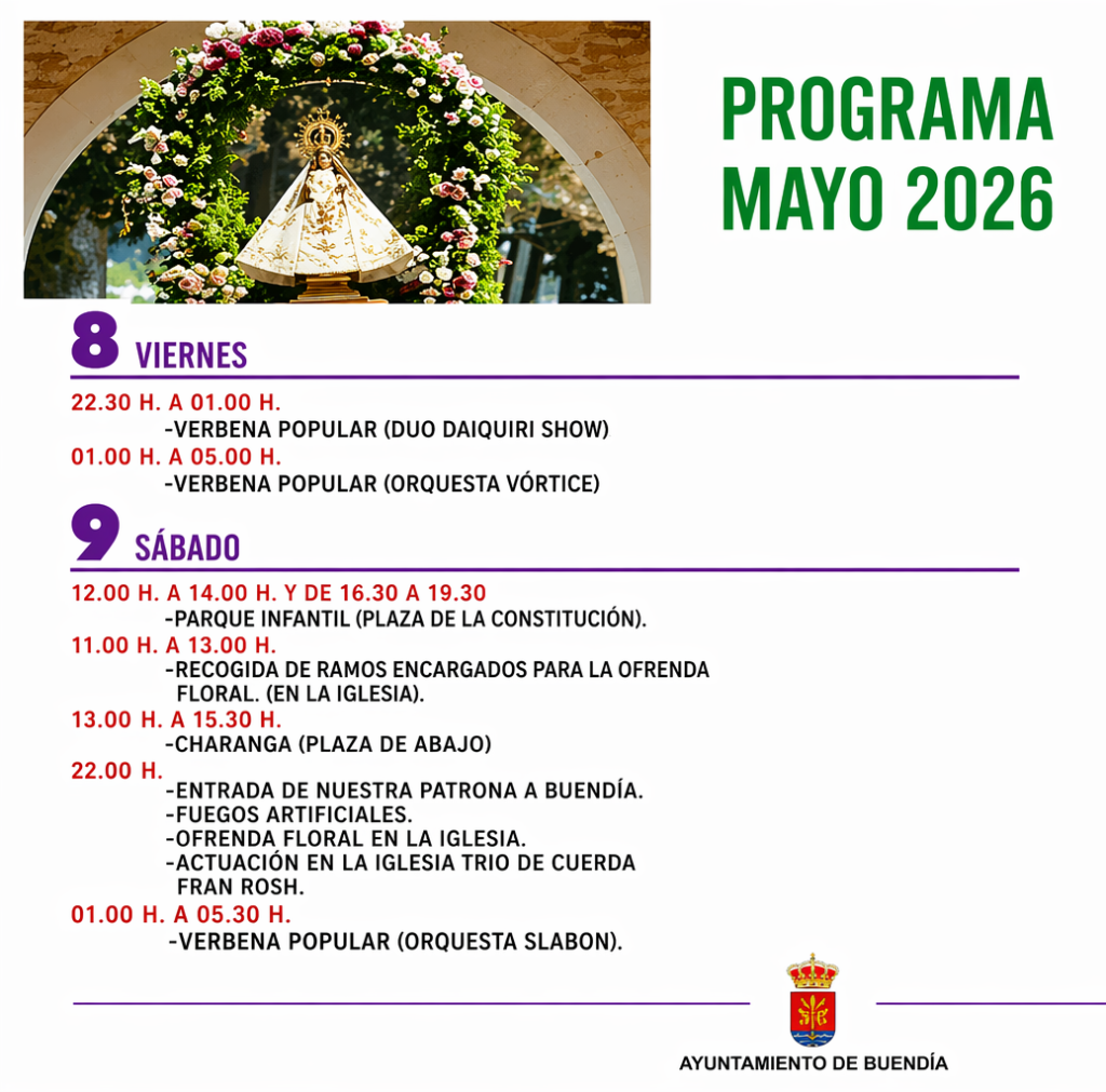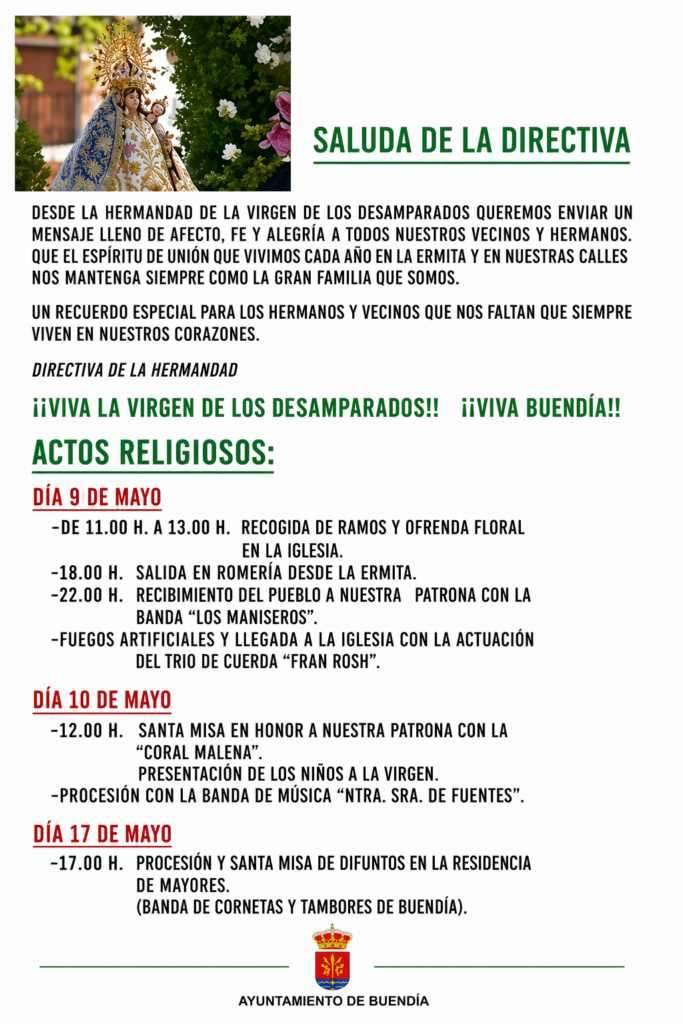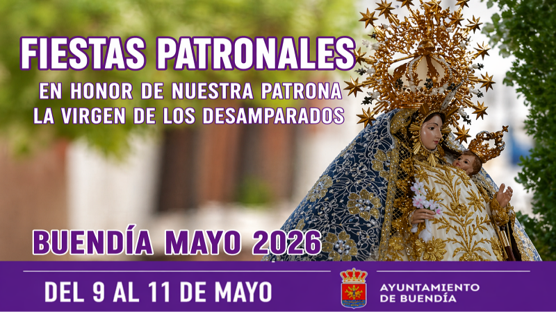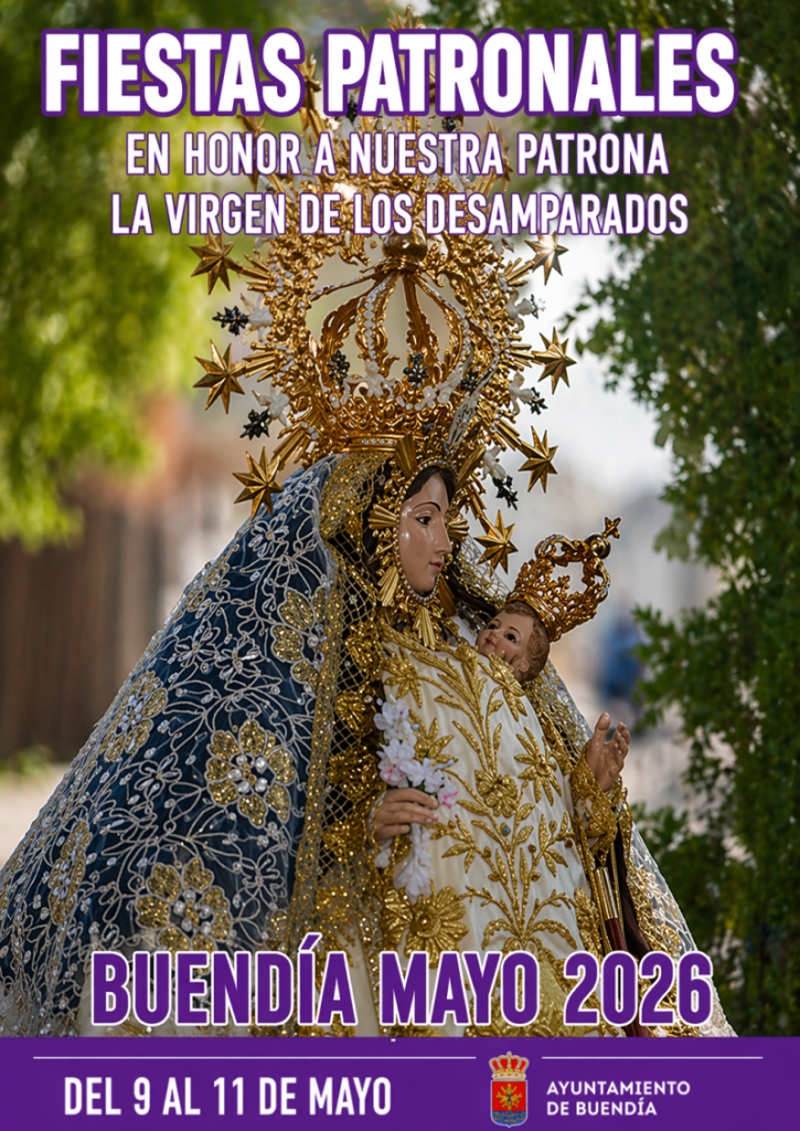 Buendía se prepara para celebrar sus Fiestas Patronales en honor a la Virgen de los Desamparados, una de las citas más esperadas del calendario local, que tendrá lugar del 9 al 11 de mayo de 2026. Durante estos días, vecinos y visitantes podrán disfrutar de una programación que combina tradición religiosa, música y convivencia.