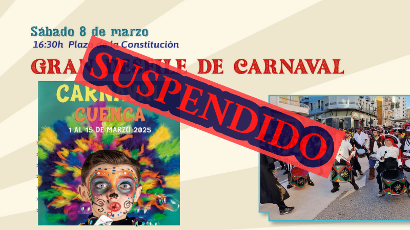 Ante el aviso amarillo de la Aemet para este sábado por viento y lluvia el Ayuntamiento de Cuenca ha decidido, por seguridad, suspender el desfile de Carnaval y realizar todas las actividades en el recinto de La Hípica a partir de las 17:00 horas. Así, de 17:00 a 18:00 horas se irá haciendo la recepción de participantes, y a partir de las 18:00 horas el jurado evaluará los disfraces.