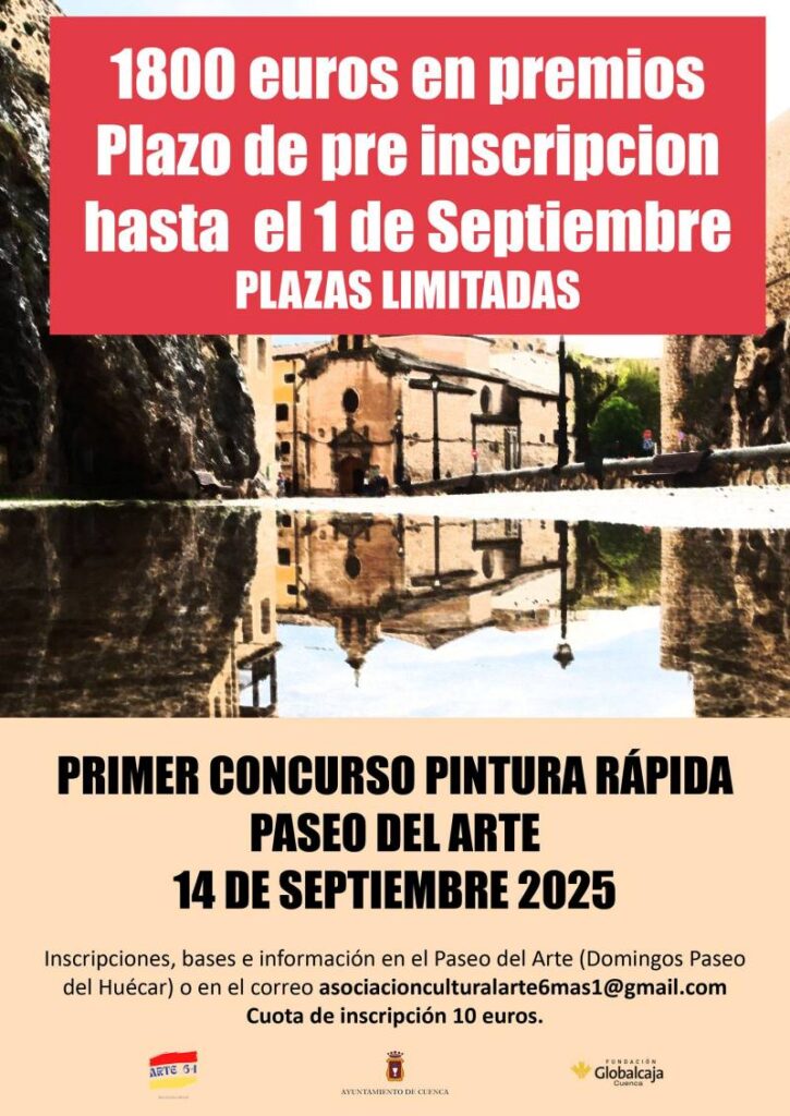 El I Certamen de Pintura Rápida Arte 6+1 se celebrará el 14 de septiembre de 2025 en el Paseo del Huécar (Cuenca) con un máximo de 40 plazas para artistas mayores de edad residentes en España. La preinscripción, imprescindible y ampliada hasta el 1 de septiembre, se realizará por correo electrónico y la inscripción definitiva el mismo día del evento. Los soportes deberán ser rígidos, blancos y de entre 56 y 146 cm, con temática centrada en el entorno del Huécar. La entrega de obras será entre las 13:00 y las 14:00 horas, y se otorgarán tres premios de 1.000 €, 500 € y 300 € respectivamente.