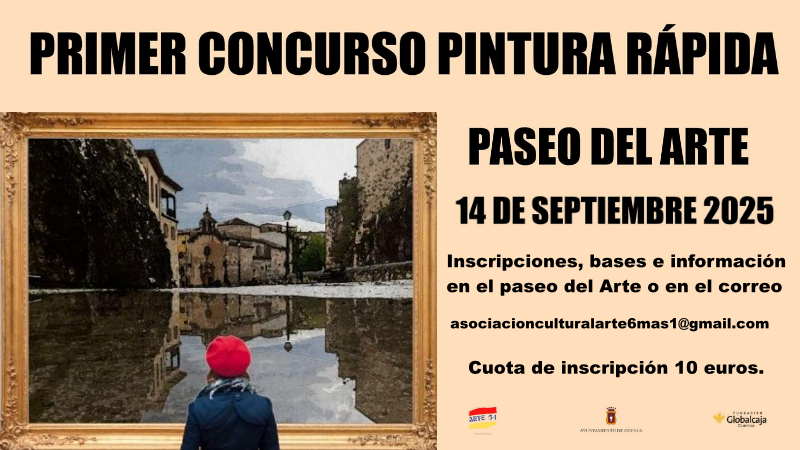 El I Certamen de Pintura Rápida Arte 6+1 se celebrará el 14 de septiembre de 2025 en el Paseo del Huécar (Cuenca) con un máximo de 40 plazas para artistas mayores de edad residentes en España. La preinscripción, imprescindible y ampliada hasta el 1 de septiembre, se realizará por correo electrónico y la inscripción definitiva el mismo día del evento. Los soportes deberán ser rígidos, blancos y de entre 56 y 146 cm, con temática centrada en el entorno del Huécar. La entrega de obras será entre las 13:00 y las 14:00 horas, y se otorgarán tres premios de 1.000 €, 500 € y 300 € respectivamente.