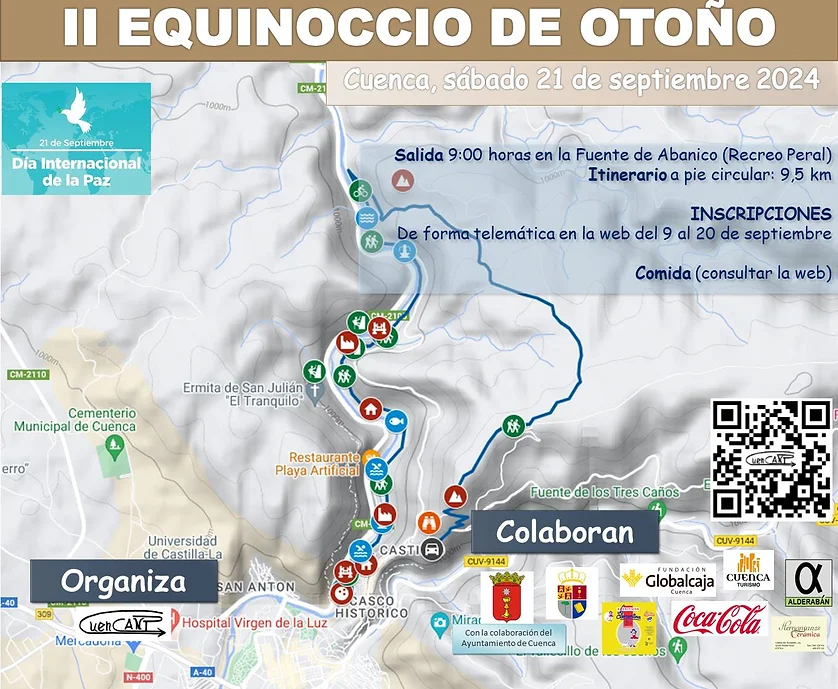 La Asociación Cultural “CuenCANP” organiza el II Equinoccio de Otoño en Cuenca, una actividad que combina ejercicio físico, contacto con la naturaleza y la promoción del patrimonio. Esta marcha se llevará a cabo el sábado 21 de septiembre de 2024, coincidiendo con el día de San Mateo y el Día Internacional de la Paz. El recorrido, de 9,5 km, partirá a las 9:00 horas desde la Fuente del Abanico en el Recreo Peral y finalizará en el aparcamiento del Castillo, en el casco antiguo de Cuenca, permitiendo a los participantes disfrutar de las fiestas mateas.