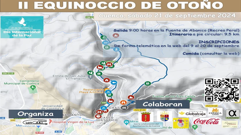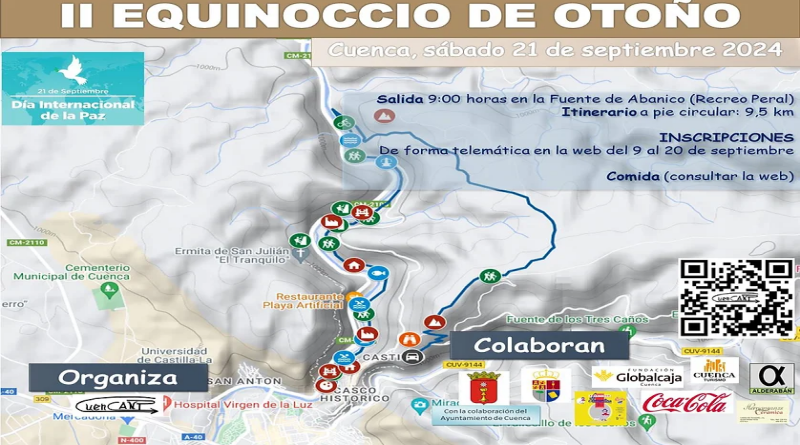 La Asociación Cultural “CuenCANP” organiza el II Equinoccio de Otoño en Cuenca, una actividad que combina ejercicio físico, contacto con la naturaleza y la promoción del patrimonio. Esta marcha se llevará a cabo el sábado 21 de septiembre de 2024, coincidiendo con el día de San Mateo y el Día Internacional de la Paz. El recorrido, de 9,5 km, partirá a las 9:00 horas desde la Fuente del Abanico en el Recreo Peral y finalizará en el aparcamiento del Castillo, en el casco antiguo de Cuenca, permitiendo a los participantes disfrutar de las fiestas mateas.