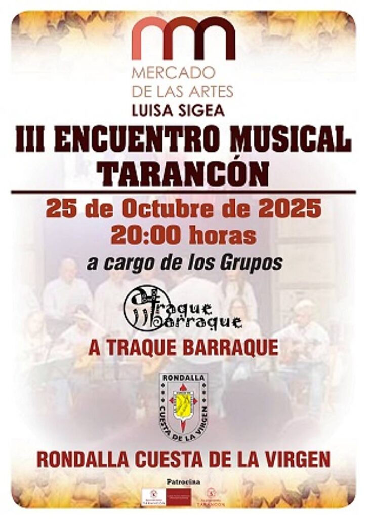 El Mercado de las Artes Luisa Sigea de Tarancón se prepara para acoger el III Encuentro Musical, una cita ineludible para los amantes de la música tradicional y contemporánea. La velada tendrá lugar el 25 de octubre de 2025 a las 20:00 horas y contará con la participación del grupo de folk segoviano A Traque Barraque y la Rondalla Cuesta de la Virgen.