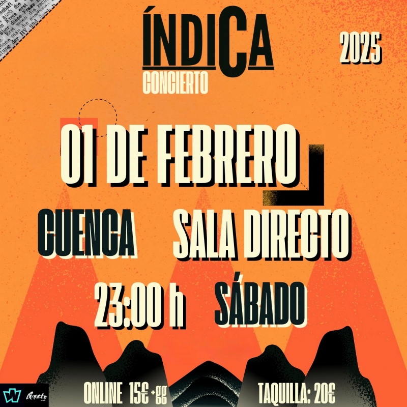 El sábado 1 de febrero de 2025, la Sala Directo de Cuenca se llenará de música, emoción y el mejor espíritu festivalero con el concierto de Índica, un grupo que ha conquistado al público con su particular forma de reinterpretar los grandes himnos del indie pop nacional. La cita será a las 23:00 horas, en un espectáculo que promete ser inolvidable.