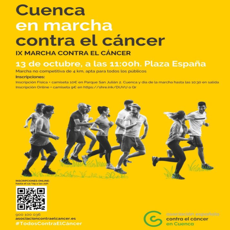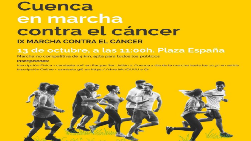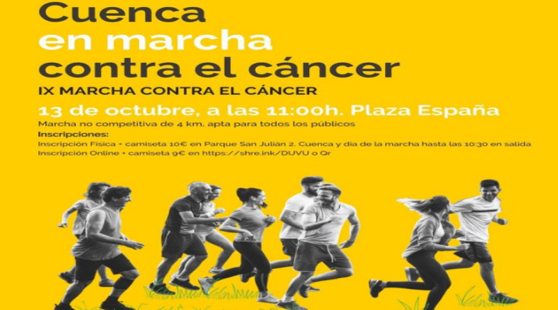 El próximo 13 de octubrela Asociación Española Contra el Cáncer en Cuenca organiza a las 11:00, la IX ‘Marcha contra el cáncer’ en Cuenca. El inicio y final de la marcha será en la Plaza de España y tendrá una distancia de 4 kilómetros, una marcha para todos los públicos y accesible el 100% del recorrido.