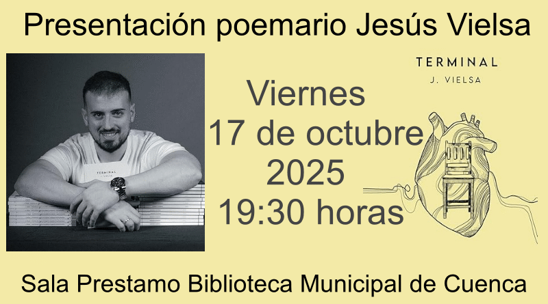 La Biblioteca Municipal de Cuenca será escenario el próximo viernes 17 de octubre de 2025, a las 19:30 horas, de la presentación de “Terminal”, el más reciente poemario de Jesús Vielsa Morante, autor taranconero que se ha consolidado como una de las voces poéticas más singulares de su generación.