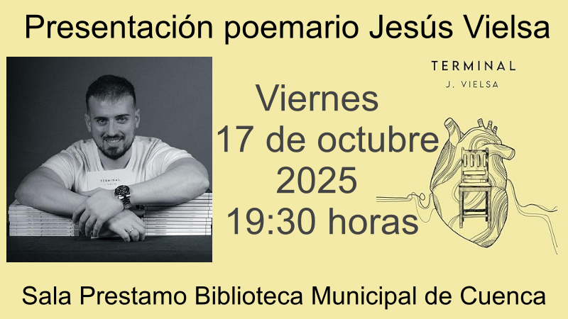 La Biblioteca Municipal de Cuenca será escenario el próximo viernes 17 de octubre de 2025, a las 19:30 horas, de la presentación de “Terminal”, el más reciente poemario de Jesús Vielsa Morante, autor taranconero que se ha consolidado como una de las voces poéticas más singulares de su generación.