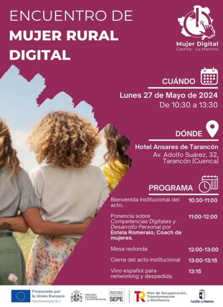 El próximo 27 de mayo de 2024, a las 10:30, se llevará a cabo la clausura del exitoso “Proyecto de Formación en Competencias Digitales a mujeres del ámbito rural” en el Hotel Ansares (Av. Adolfo Suárez 32, Tarancón). Esta iniciativa, promovida por el Gobierno de Castilla-La Mancha y financiada a través del Mecanismo de Recuperación y Resiliencia, se enmarca en el Plan de Recuperación, Transformación y Resiliencia, destacándose dentro de los proyectos de inversión “Plan Nacional de Competencias Digitales” y “Nuevas Políticas Públicas para un mercado de trabajo dinámico, resiliente e inclusivo”.