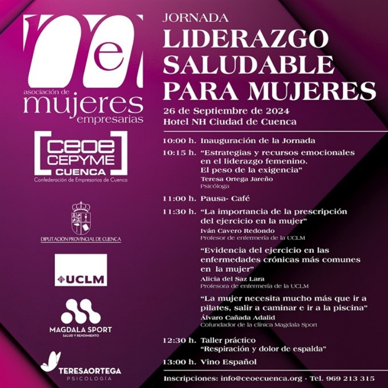La Asociación Provincial de Mujeres Empresarias de Cuenca, AMEP y CEOE CEPYME Cuenca, celebran el próximo jueves 26 de septiembre la jornada ‘Liderazgo saludable para mujeres’ en el Hotel NH de Cuenca.