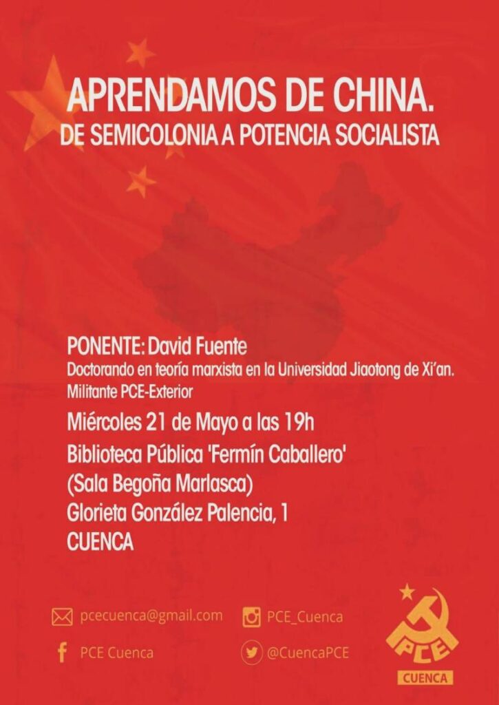 El próximo miércoles 21 de mayo a las 19:00 h, la Biblioteca Pública del Estado en Cuenca ‘Fermín Caballero’ acoge la conferencia “Aprendamos de China: de semicolonia a potencia socialista”, impartida por el investigador y divulgador David Fuentes.