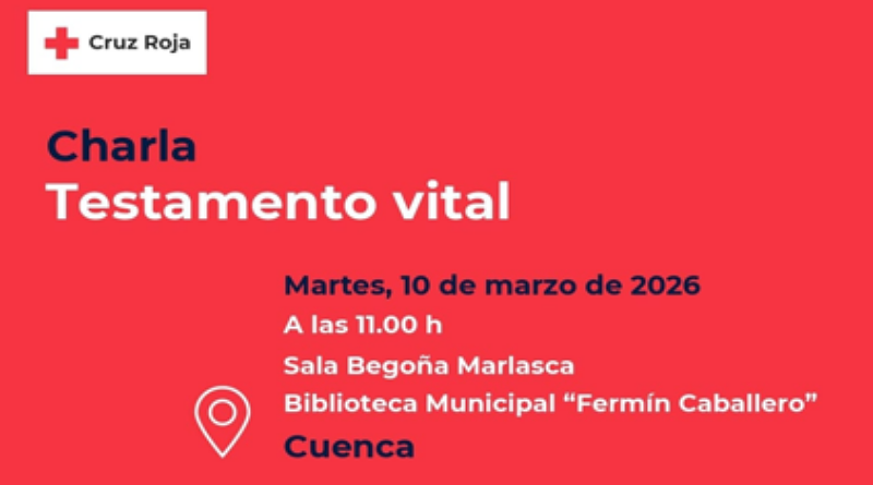 La Biblioteca Municipal Fermín Caballero de Cuenca acoge este martes 10 de marzo de 2026 a las 11:00 horas una charla informativa sobre el Testamento Vital, organizada por Cruz Roja, con el objetivo de acercar a la ciudadanía el conocimiento de este documento que permite expresar de forma anticipada las decisiones sobre la atención sanitaria y los cuidados al final de la vida.