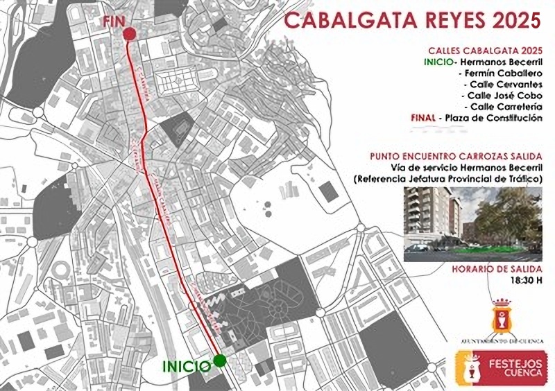 En concreto, la Cabalgata partirá a las 18:30 horas desde la avenida de Hermanos Becerril a la altura de la Plaza de la U, desde donde continuará por Fermín Caballero, Cervantes, José Cobo, Plaza de la Hispanidad y Carretería hasta llegar a la Plaza de la Constitución, desde donde sus Majestades irán a pie hasta el Parque de San Julián, donde tendrá lugar la Recepción Real.