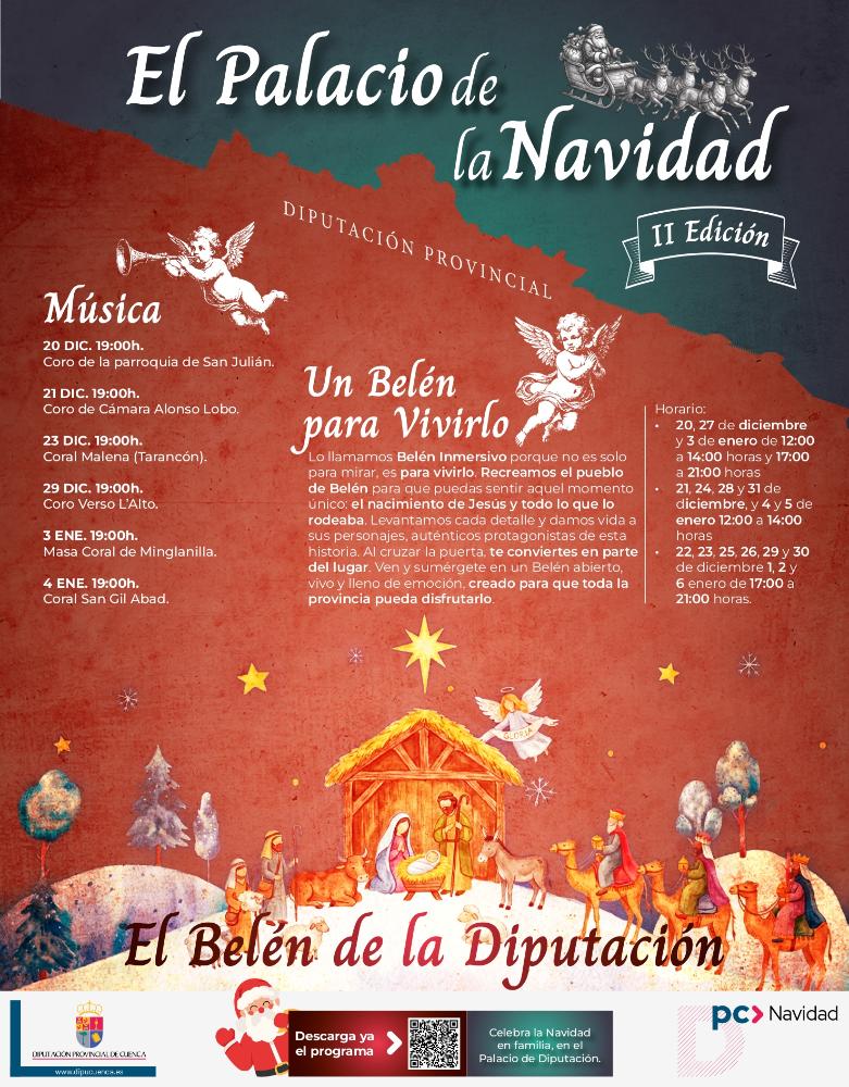 La Diputación Provincial de Cuenca presenta la II edición del “Palacio de la Navidad”, una programación navideña que combinará tradición, música y cultura en el Palacio Provincial entre el 20 de diciembre de 2025 y el 5 de enero de 2026. El evento incluye un belén inmersivo, conciertos corales y actuaciones musicales que pretenden animar las fiestas y ofrecer una agenda colectiva para toda la provincia.