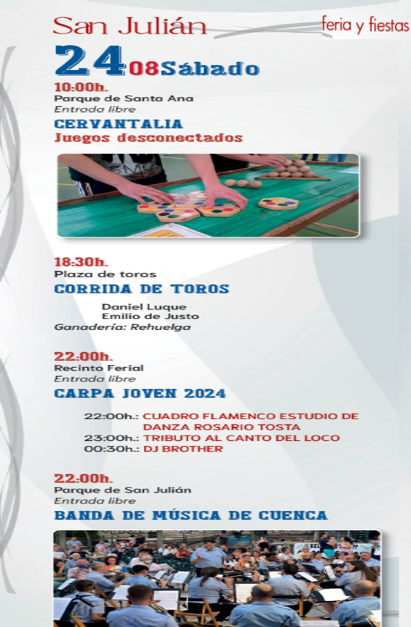 Este sábado, la programación de San Julián ofrece una amplia gama de actividades que permitirán a todos los asistentes disfrutar de la cultura, la música y las tradiciones que caracterizan estas festividades en Cuenca.