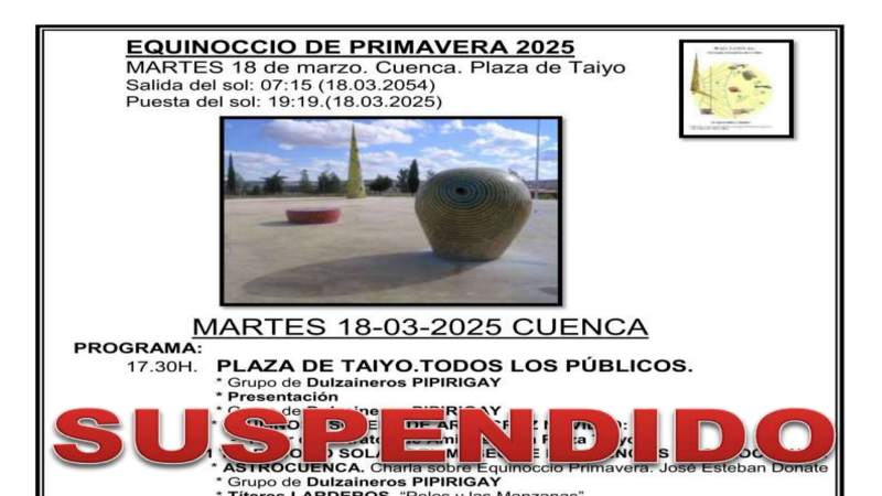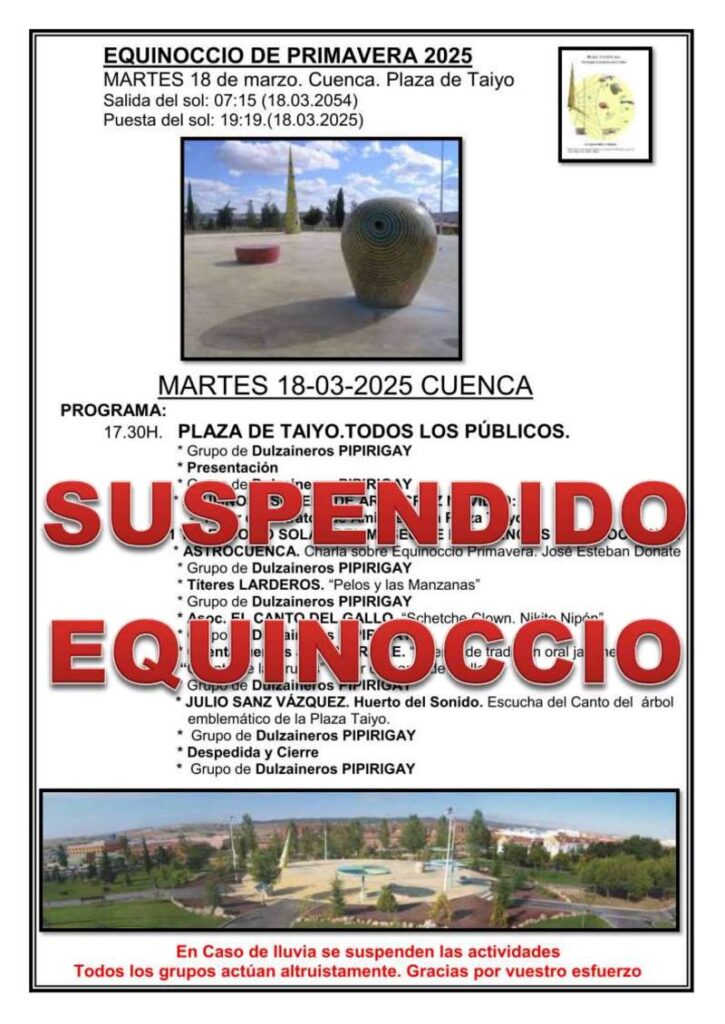 Se suspende el Equinoccio de Primavera del 18 de marzo de la Plaza Taiyo en Cuenca, por la previsión de lluvia. Nos vemos en el Solsticio de Verano el 19 de junio. Feliz primavera!