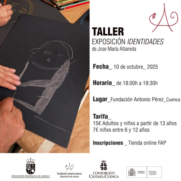El Programa de Mediación de la Fundación Antonio Pérez (FAP) de Cuenca propone el próximo viernes 10 de octubre de 2025 un taller creativo inspirado en la muestra temporal “Identidades” del artista José María Albareda. La actividad se celebrará de 18:00 a 19:30 horas, con inscripción previa a través de la tienda online de la Fundación.