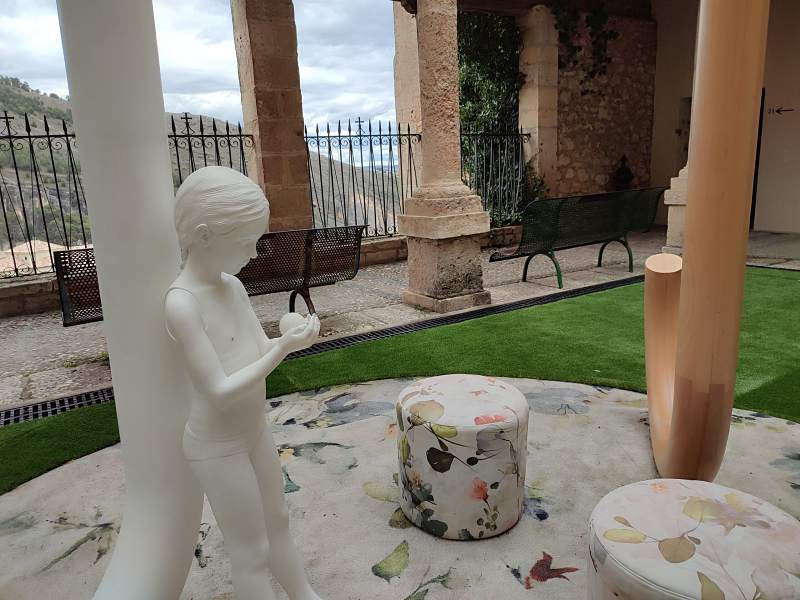 En este escenario onírico, dos esculturas monumentales, concebidas ex profeso para la muestra, actúan como guardianes simbólicos de una dimensión entre lo real y lo etéreo. A su alrededor, un jardín textil con estampas florales y pufs invita a la pausa y a la reflexión. Una iluminación ambiental delicada y las esculturas de una figura infantil completan este ecosistema artístico cargado de simbolismo.