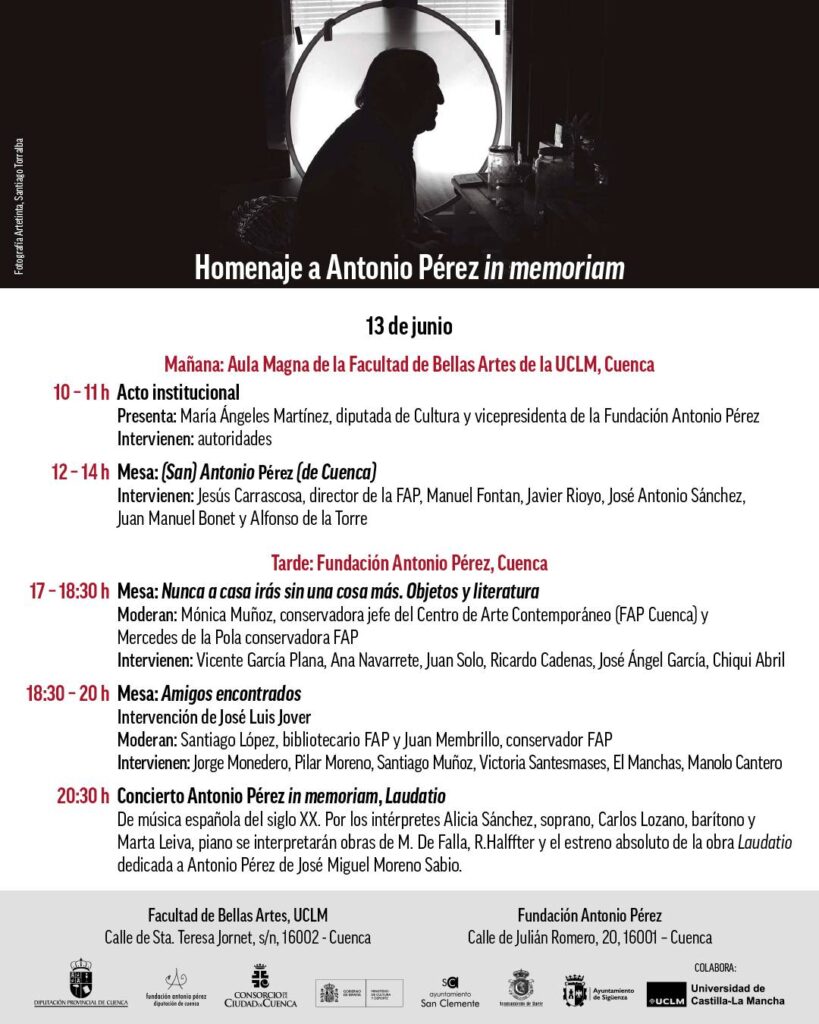 El programa contará con un acto institucional a las 10h de la mañana que será presentado por María Ángeles Martínez, diputada provincial de Cultura y vicepresidenta de la FAP; la proyección de un video sobre la vida de Antonio Pérez; y una mesa redonda a las 12h que lleva por título “(San) Antonio Pérez (de Cuenca)”, en la que intervendrán Jesús Carrascosa, director de la FAP, Manuel Fontán, director del Museo de Arte Abstracto Español de Cuenca, Javier Rioyo, periodista cultural, José Antonio Sánchez, catedrático y profesor de la Facultad de Bellas Artes de Cuenca, Juan Manuel Bonet, crítico de arte, y el también crítico de arte Alfonso de la Torre.