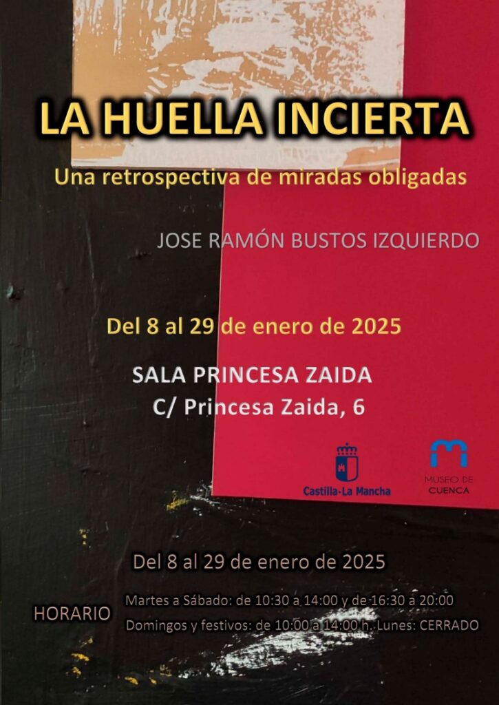 El próximo miércoles, día 8 de enero de 2025 a las 18:30 horas, en la Sala de Exposiciones temporales PRINCESA ZAIDA del Museo de Cuenca (C/ Princesa Zaida, 6) tendrá lugar la inauguración de la exposición temporal “LA HUELLA INCIERTA. Una retrospectiva de miradas obligadas”, del artista Jose Ramón Bustos Izquierdo.