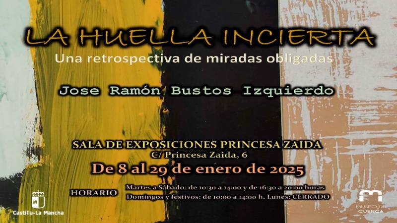 El próximo miércoles, día 8 de enero de 2025 a las 18:30 horas, en la Sala de Exposiciones temporales PRINCESA ZAIDA del Museo de Cuenca (C/ Princesa Zaida, 6) tendrá lugar la inauguración de la exposición temporal “LA HUELLA INCIERTA. Una retrospectiva de miradas obligadas”, del artista Jose Ramón Bustos Izquierdo.