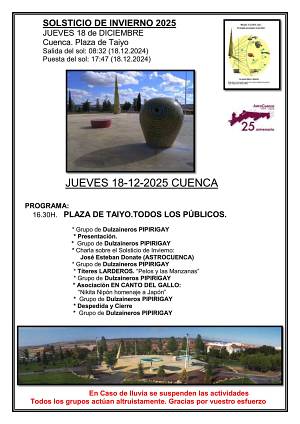 El evento comenzará a las 16:30 horas, ofreciendo una tarde repleta de música, divulgación astronómica, títeres y homenajes culturales. Según el cartel oficial, la programación será la siguiente: música del Grupo de Dulzaineres Pipirigay, presentación inicial y charla sobre el Solsticio de Invierno a cargo de José Esteban Donate (ASTROCUENCA), seguida de más música del Grupo de Dulzaineros Pipirigay. A continuación, actuarán Títeres Larderos con la obra “Pelos y las Marcas”, y posteriormente habrá música del Grupo de Dulcineras Pipirigay. También participará la Asociación En Canto del Gallo, que presentará “Nikita Nipón, homenaje a Japón”. La jornada continuará con más música del Grupo de Duizainers Pipirigay, y concluirá con la despedida y cierre.