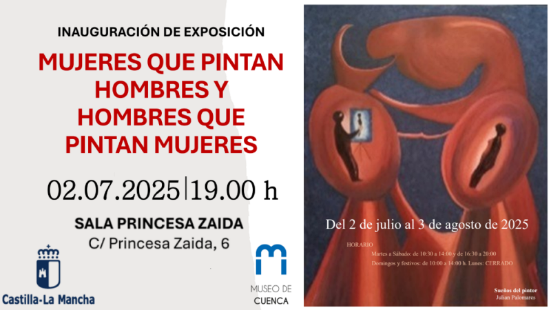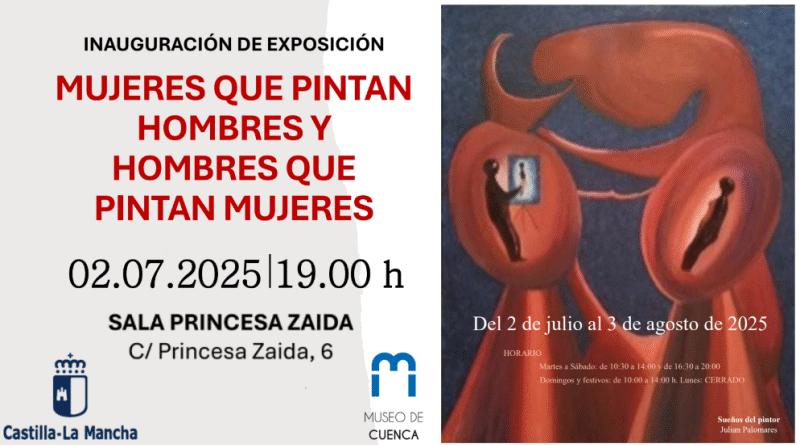 El próximo miércoles 2 de julio de 2025 a las 19:00 horas se inaugura en la Sala de Exposiciones Princesa Zaida del Museo de Cuenca la muestra colectiva “Mujeres que pintan hombres y hombres que pintan mujeres”, una propuesta expositiva de gran calado intelectual y artístico que podrá visitarse hasta el 3 de agosto.