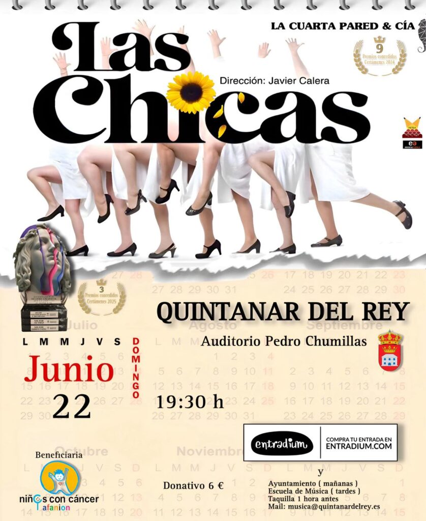 Quintanar del Rey se viste de teatro solidario este domingo 22 de junio a las 19:30 h con la representación de “Las chicas”, una comedia original, divertida y premiada, bajo la dirección de Javier Calera y representada por La Cuarta Pared & Cía.